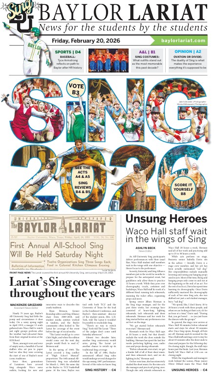 Nearly 75 years ago, Baylor’s All-University Sing had little the pomp and circumstance it does today. On a rainy spring night in April 1953, a meager 13 souls gathered into Waco Hall to watch just eight groups perform after the weather had relocated them from their original location at the SUB Bowl.