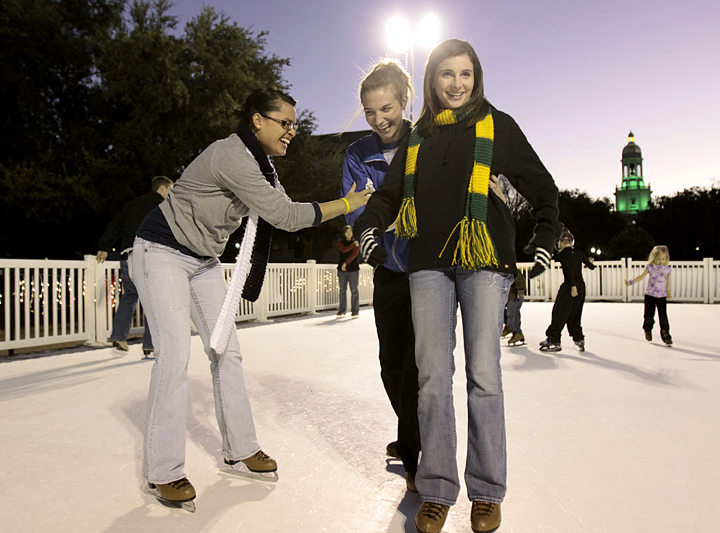 This year Baylor On Ice, a synthetic ice skating rink, is set up on Fountain Mall. Skating is free from 6 to 7 p.m. today, but costs $5 or a toy donation during the rest of the event. This is the second year the Interfraternity Council has sponsored the event, but this is the first year it has been connected to Christmas on 5th Street.