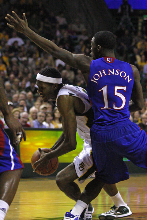 No. 41 junior Anthony Jones drives the ball around Kansas’ No. 15 Elijah Johnson during Monday’s game at the Ferrell Center. Baylor lost, 85-65.