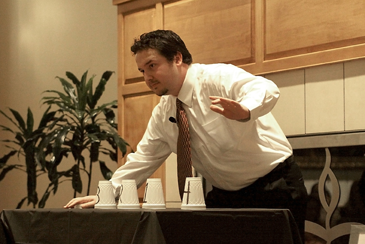 Adams then selected another volunteer and allowed the volunteer to guess where the spike was. Adams proceeded to go down the line of cups, slamming his hands down onto the cups. This tension was built even higher by the fact that Adams prefaced this trick with the statement that he has seen and known other illusionists who have “messed up” this trick before.