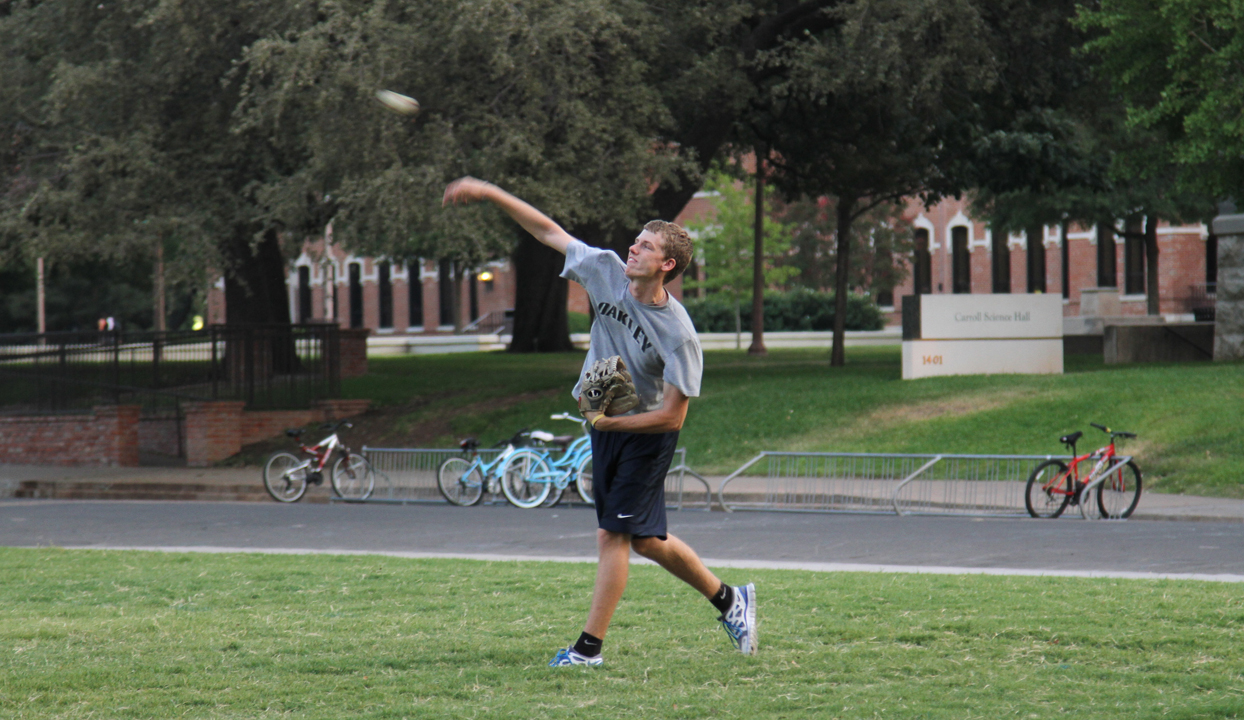 San Antonio, Tex., freshman Austin Hank tosses around a baseball on Wednesday, Sept. 7, 2011, at Fountain Mall. Students opted for another night outdoors in the cooler weather. Meagan Downing | Lariat Photographer