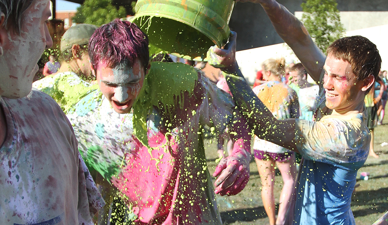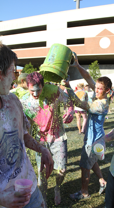 Franklin, Mass., freshman Drew Latham is covered in green paint by Prosper freshman Mark Matie during Paint Crush at Minglewood Bowl on Monday, Sept. 27, 2011.