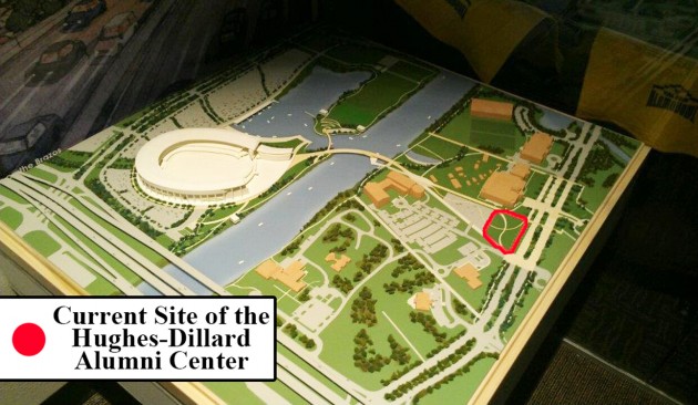 The Hughes-Dillard Alumni Center is missing from a model of the proposed football stadium, the third such rendering depicting the north end of campus without the home of the Baylor Alumni Association.