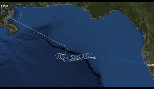 A computer-generated image provided by FlightAware, a private aviation flight path service, shows the plane traveling in several circles over the Gulf before going down. A C130 and a helicopter looked for debris from the submerged plane, said Coast Guard Petty Officer Elizabeth Borderland. A cutter would remain in the area all night, she said.