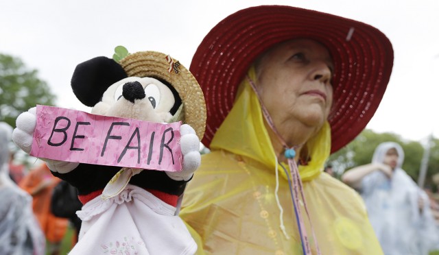 Demonstrator Carole Fields of Palm Beach, Fla., listens to a speech, on Monday in Tampa. Hundreds of protestors gathered in a park in Tampa to march in demonstration against the Republican National Convention.
