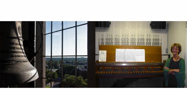 Lynnette Geary stands beside the McLane Carillon located on the top floor of Pat Neff Hall. She has performed a recital every year on 9/11 since the attacks on the World Trade Center in 2001.