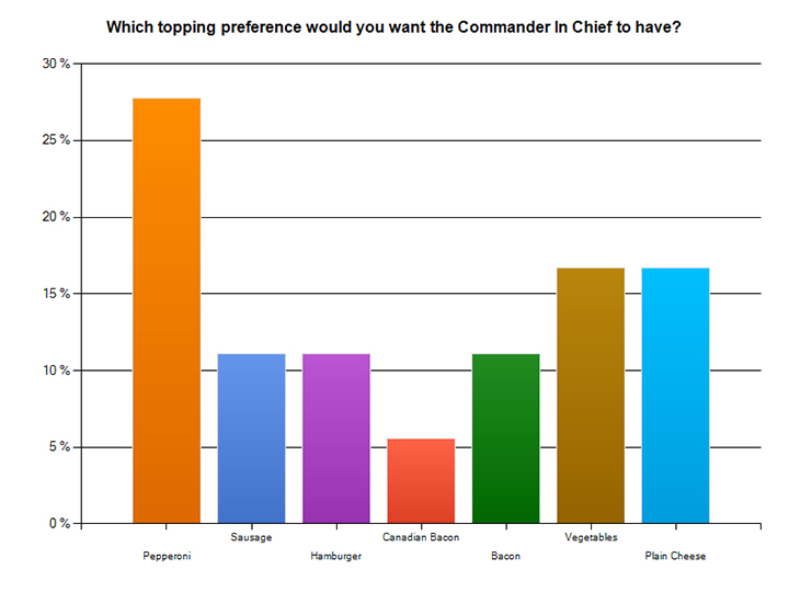 When asked what toppings you wanted the Commander in Chief to have 27.8 percent said pepperoni, 11.1 percent said hamburger, sausage or bacon, 16.7 percent said vegetables or plain cheese and 5.6 percent said bacon.