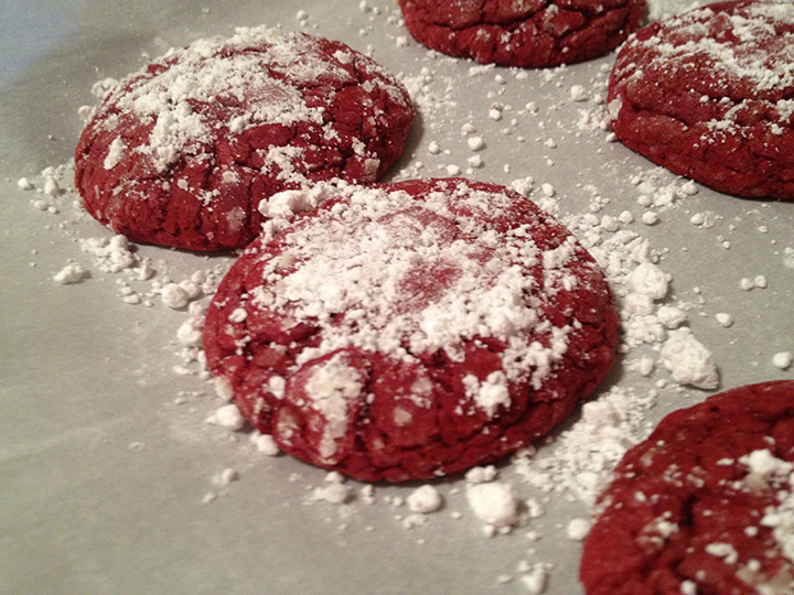 After that, everything went fairly smoothly, although the powdered sugar got everywhere. I rolled and placed the cookies on the parchment paper-covered sheet and popped them in the oven. I only baked them for the minimum nine minutes, and they turned out beautifully. So beautiful, in fact, that it was hard to see how such perfectly-formed and innocent-looking cookies had not only dyed my hands and face red, but resulted in the powdered-sugaring of my entire kitchen.