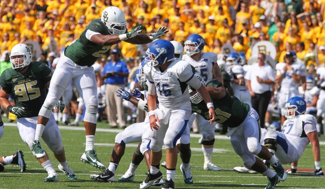 Baylor’s stingy defense did not give up a touchdown for the first 10 quarters of the season, but Buffalo quarterback Joe Licata tossed a shovel pass to receiver Devon Hughes for the first touchdown scored against Baylor this year. Just two and a half minutes later, Buffalo running back Anthone Taylor broke a tackle from sophomore linebacker Aiavion Edwards to explode for a 41-yard touchdown.