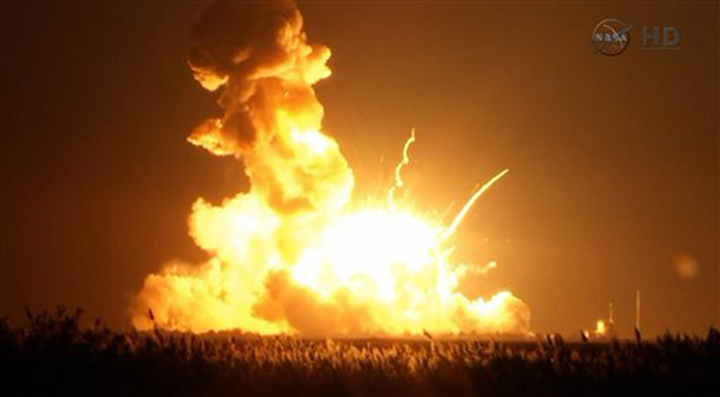 This image, taken from video provided by NASA TV, shows Orbital Sciences Corp.’s unmanned rocket blowing up over the launch complex at Wallops Island, Va., just six seconds after liftoff Tuesday evening.