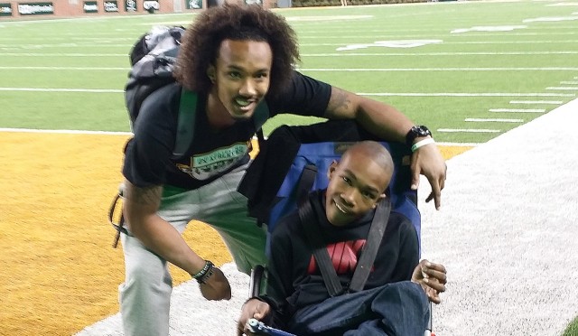 Senior receiver Levi Norwood meets with Midway High School student Jacoby Burks following the Bears’ win on Saturday. With its seven TDs, Baylor raised over $6,000 to support cerebral palsy research.