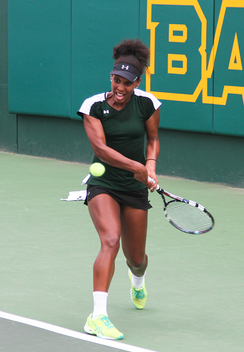 No. 82 junior Kiah Generette returns the ball Friday afternoon in the Hurd Tennis Center. The Lady Bears won the match 4-0. Skye Duncan | Lariat Photo Editor