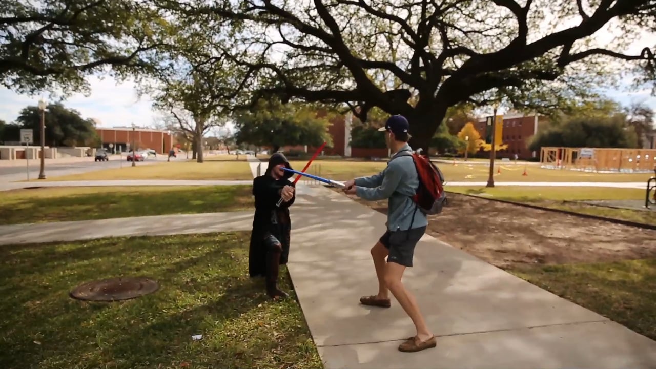 Share Facebook Twitter LinkedIn Pinterest Email Watch as a Sith Lord wanders and fights his way across Baylor’s campus. Baylor Finals Star Wars study