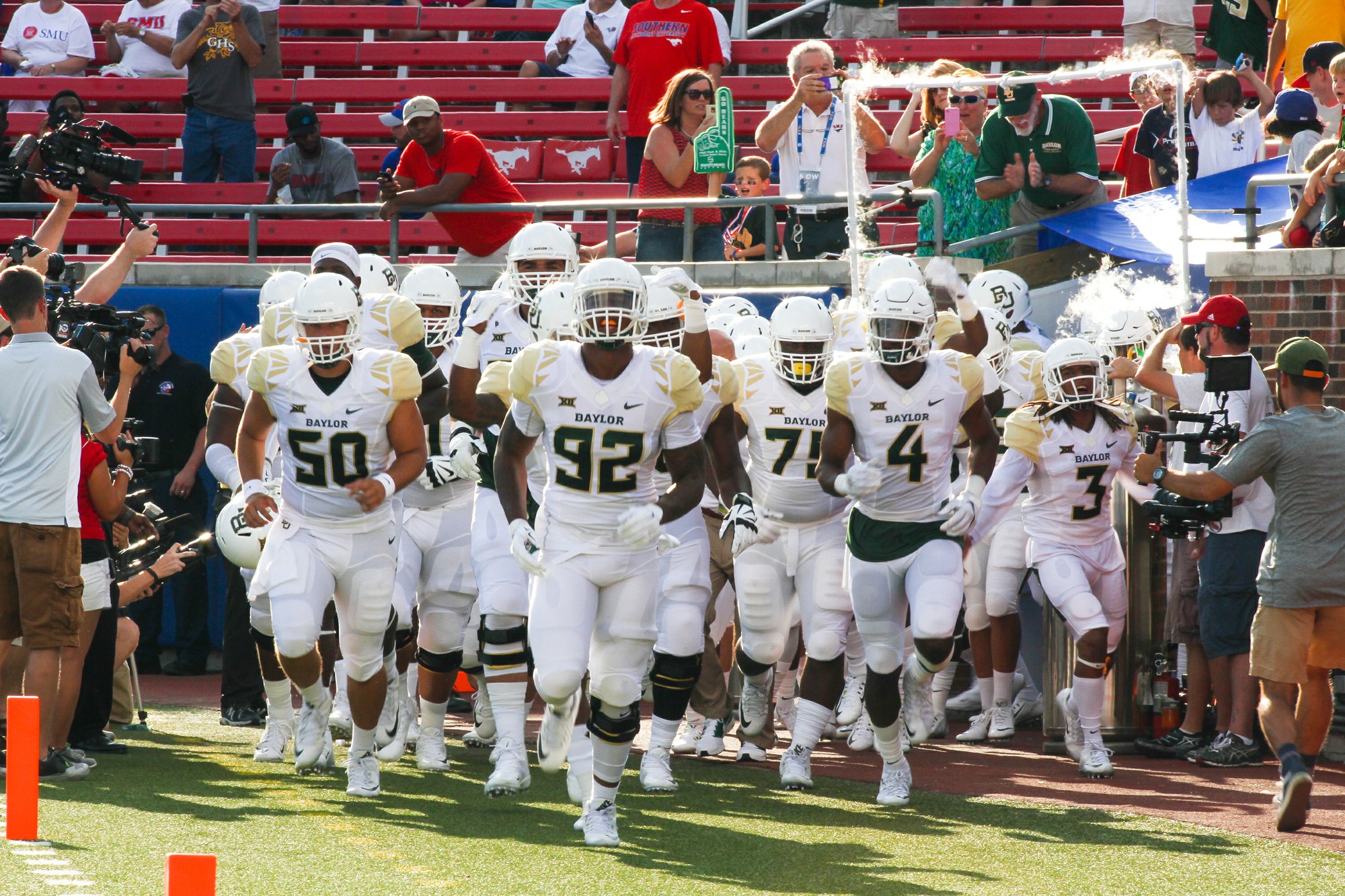 The Bears take the field at Gerald J. Ford Stadium to take on Southern Methodist University on September 4, 2015. The Bears cruised past the Mustangs 56-21. Photo Credit: Sarah Pyo