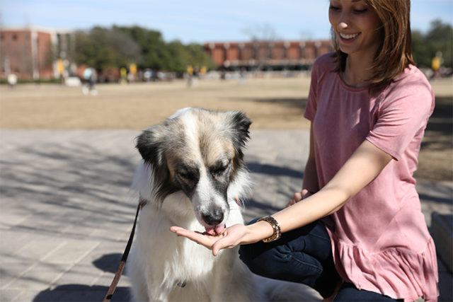 Dlaine Miley, a recent graduate of Baylor, volunteers as an Angel Paws dog handler. Miley and her therapy dog O’Riley were part of the Angel Paws team that came to Fountain Mall on Tuesday.