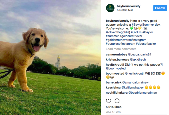 “My favorite picture is the picture of the ‘very good pupper enjoying a #BaylorSummer day,'” said Haley Everroad, a sophomore from Scottsdale, Ariz. “I feel like this picture truly shows the playfulness and lightheartedness that Baylor cultivates alongside their intense scholastic environment. Also, I just really like puppers.”