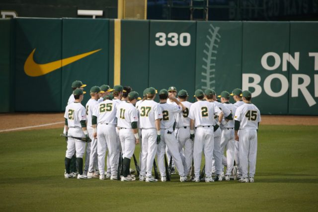 Baylor baseball gathers in the outfield prior to its season opener with Houston Baptist on Feb. 16. Photo Credit: Baylor Photography