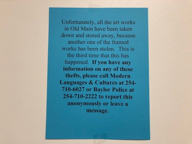 In an effort to protect the department’s investment of replica and original paintings, building officials took more than 88 of the remaining works of art down and have stored them in an undisclosed location. Long said they would like to bring back the works of art, but will be meeting with the Baylor Police Department Friday to consider ways to prevent further robberies.
