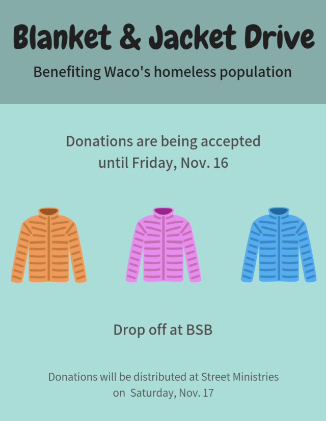 “I hope Baylor students realize how much of an impact this drive will make on the homeless population of Waco,” Riesberg said. “Since it’s such a prominent population and the weather is starting to get colder, there’s more of a need than ever for a cause like this, and I hope people are able to see the difference they have the opportunity to make. Homeless people are presented with all kinds of difficulties each and every day, and it’s only amplified when it’s cold outside and they don’t have the means to stay warm.”