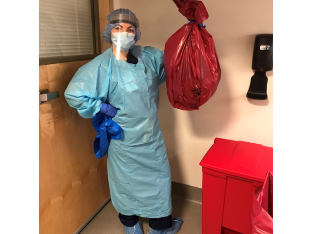 Gustafson is one of the emergency nurses who has been trained specifically to help treat COVID-19 patients, meaning that she works with suspected cases everyday, seeing anywhere between 20 to 40 patients in a 24-hour period. She said when she goes to see a patient there is a large amount of PPE (Personal Protective Equipment) that must be worn.
