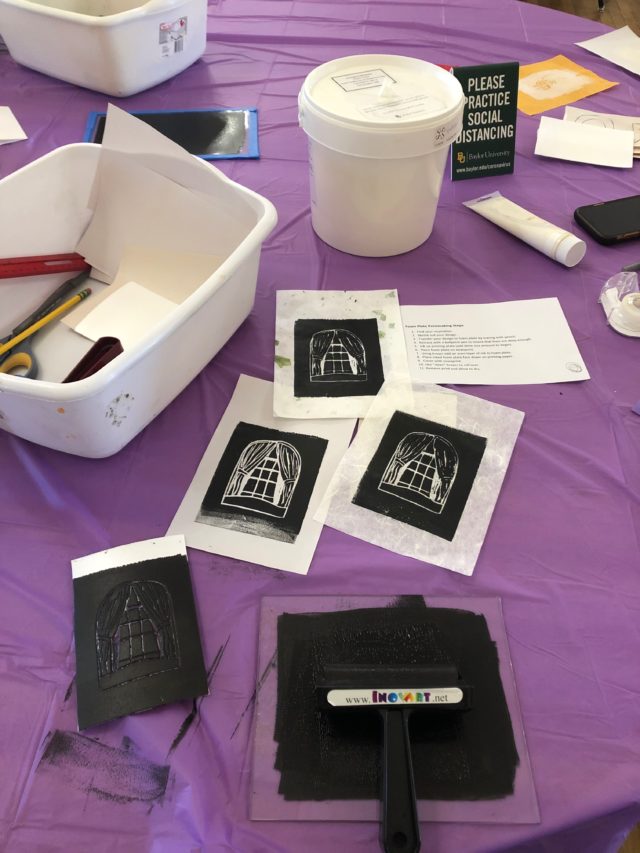 Printmaking is a process that involves transferring images from a template onto another surface, most often paper or fabric. During the event, students chose either a stencil provided by the hosts or sketched their own onto a piece of foam. They were instructed to apply ink on a surface, put it onto a roller and roll the ink on the foam. Then they turned the foam over and pressed it onto the piece of paper, revealing a print when the foam was peeled off. Students were able to take their prints home in a plastic bag provided by the volunteers.