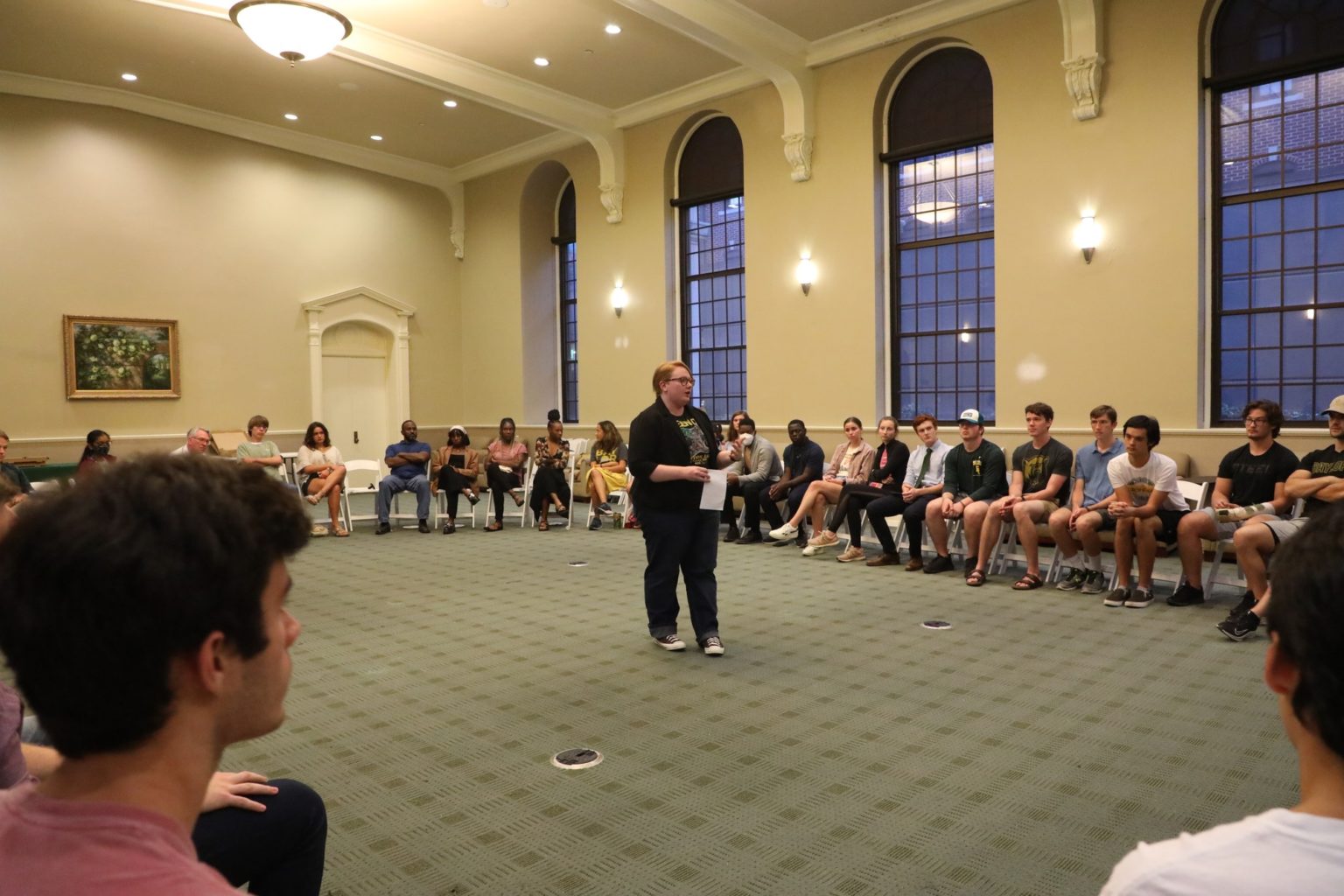 The rules of the debate were outlined by Braver Angels media editor Luke Nathan Phillips. Phillips said that speakers would come up and share their views; then, there would be time for two questions from audience members. Phillips said that when asking questions, audience members had to address him as “Mr. Chair” and refer to the person who just shared their opinion as “the speaker.”