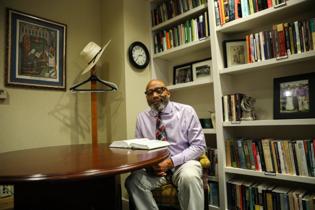 Dr. Stephen Breck Reid reads the Bible in his office located in Pat Neff Hall. Kenneth Prabhakar | Photographer