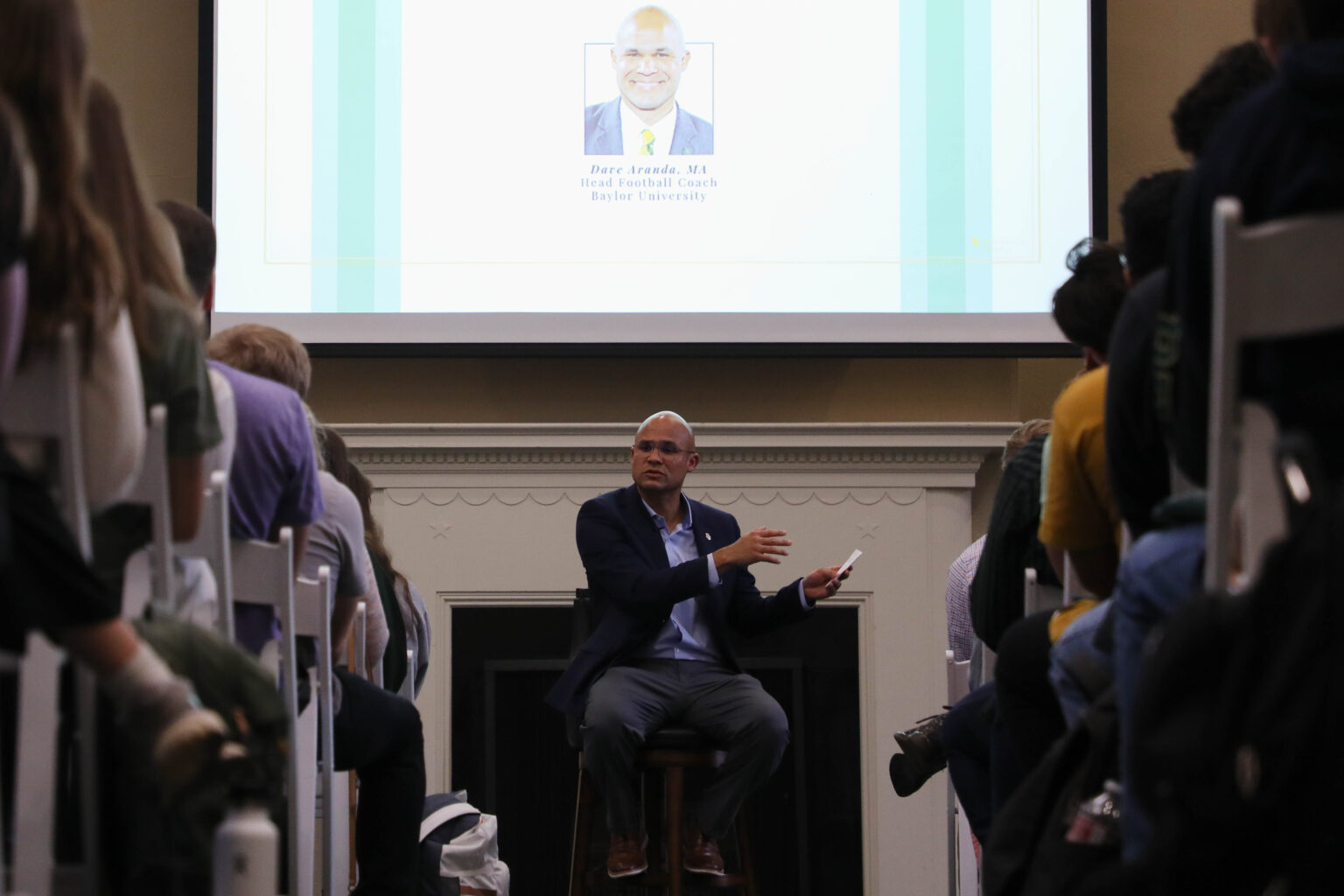 Dave Aranda, football head coach, addressed a room full of honors students on faithful leadership Thursday night as an installment of the Honors Residential College Formation Series. He discussed his emphasis on the person over the player and his journey to Baylor.