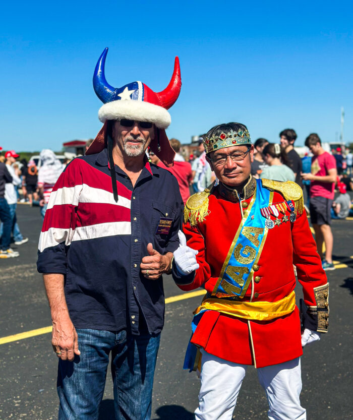 Two Trump supporters dress up for the rally in excitement for the former president's first campaign stop in Waco Saturday. Kenneth Prabhakar | Photo Editor