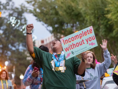 Kassidy Tsikitas | Photo Editor- Baylor students pose in front of the blacked out dia sign. Mia Crawford | Photographer