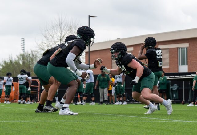 Redshirt senior Cooper Lanz shifted further to the outside, changing from defensive tackle to defensive end. With two new starters on the line, his transition is crucial to Baylor’s defense.