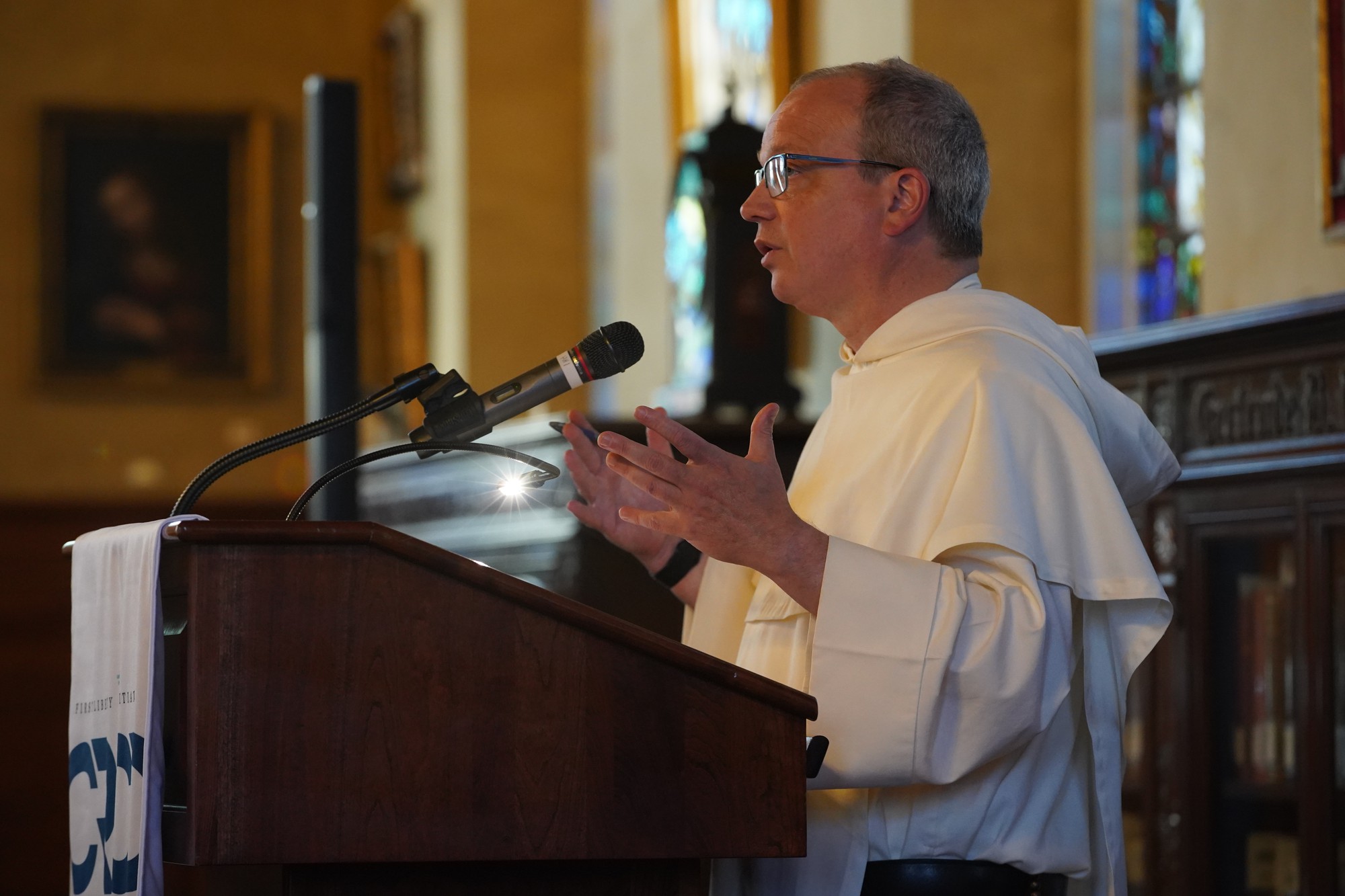Rev. Thomas Joseph White, rector magnificus of the Pontifical University of St. Thomas and banjo player for the Hillbilly Thomists, gave a lecture titled “‘Who Do Men Say That I Am?’ On the Christological Promise of the Council of Nicaea.” White discussed interpretations of the Council of Nicaea through the lens of later councils with a focus on Christology, or the study of Jesus Christ.