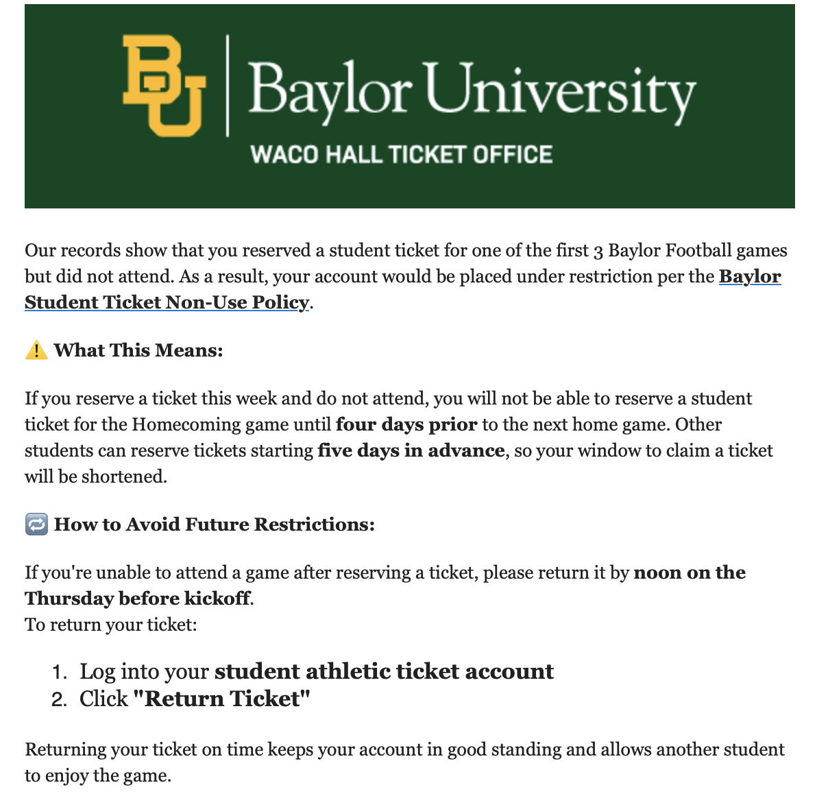 Many students reported receiving an email from the Waco Hall Ticket Office Sunday. The email warned that because the student bought tickets for one of the first three home football games and didn’t attend, one more occurrence would delay them in purchasing tickets for the Homecoming game Nov. 1.