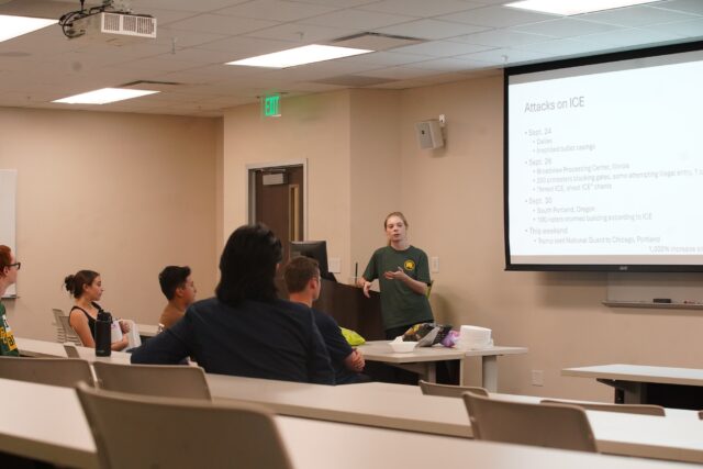 Attendees were encouraged to discuss current events, such as the Gaza Peace Deal and the government shutdown, with slides filled with fast facts to aid participants in discussion.
