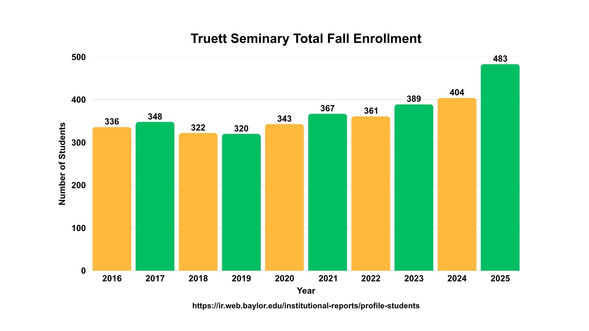 According to the Baylor Institutional Research website, with four years of enrollment steadily increasing, Truett Seminary has achieved a new record for enrollment with 483 students. According to the website, the previous record was 407 students last fall.