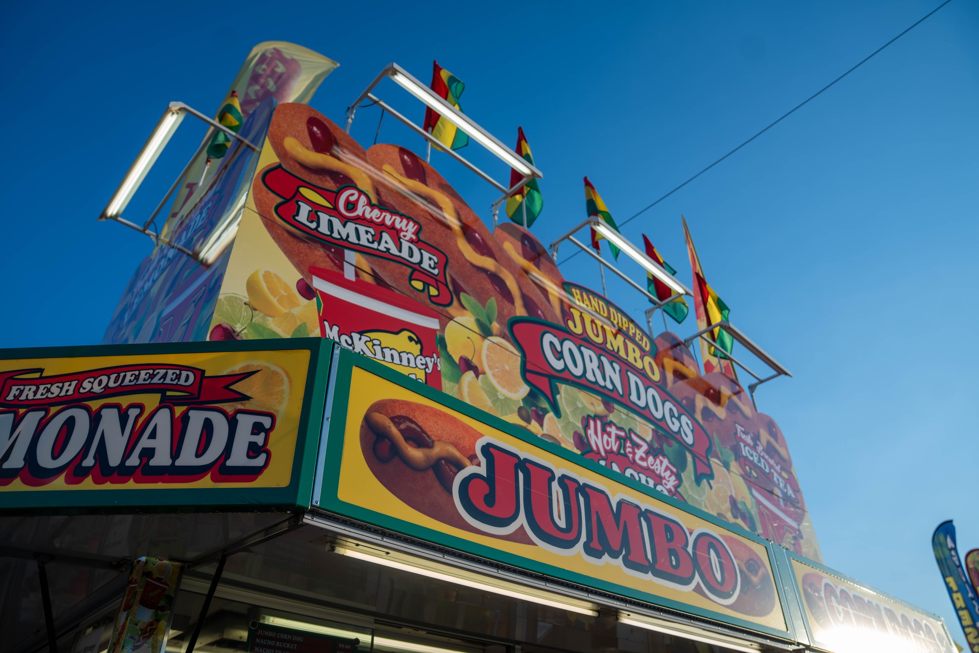 Brightly lit and impossible to miss, these lemonade stands are a fairground staple. With giant signs advertising “Jumbo Corn Dogs,” “Fresh Squeezed Lemonade” and “Fresh Brewed Iced Tea,” it’s the kind of place you walk up to without thinking. The lemonade comes in a tall, red and yellow cup, poured over ice and made to order. It’s sweet, tart and disappears fast. Cheap refills, no fancy mug, but for $9 and $5 refills, it’s a sure way to cool down during a hot day at the fair.