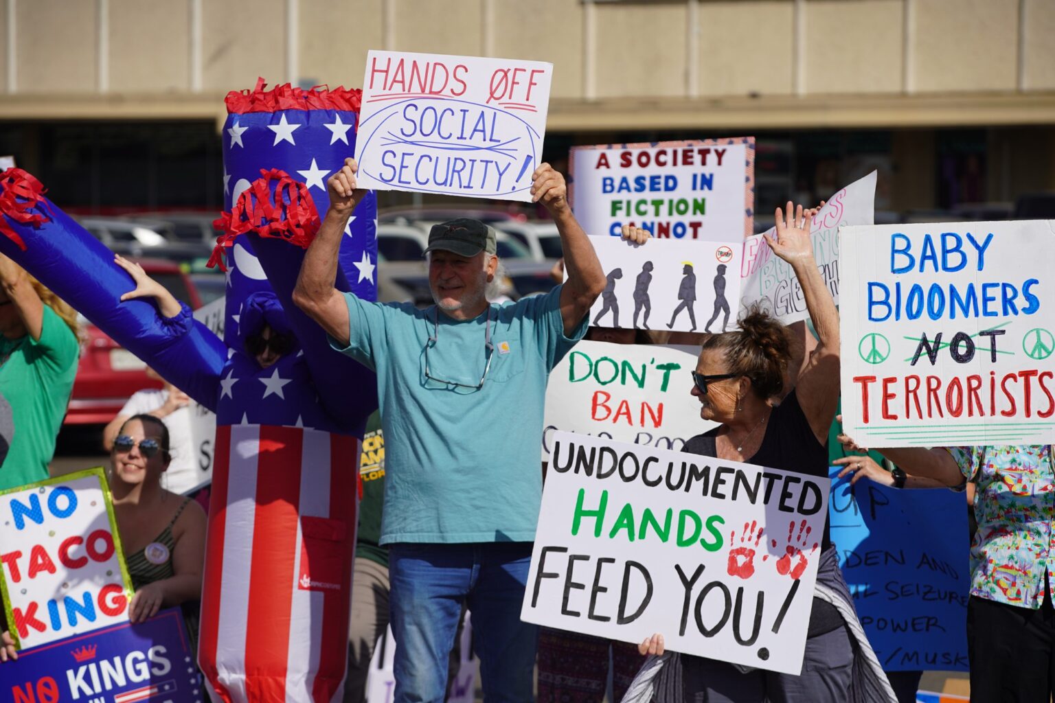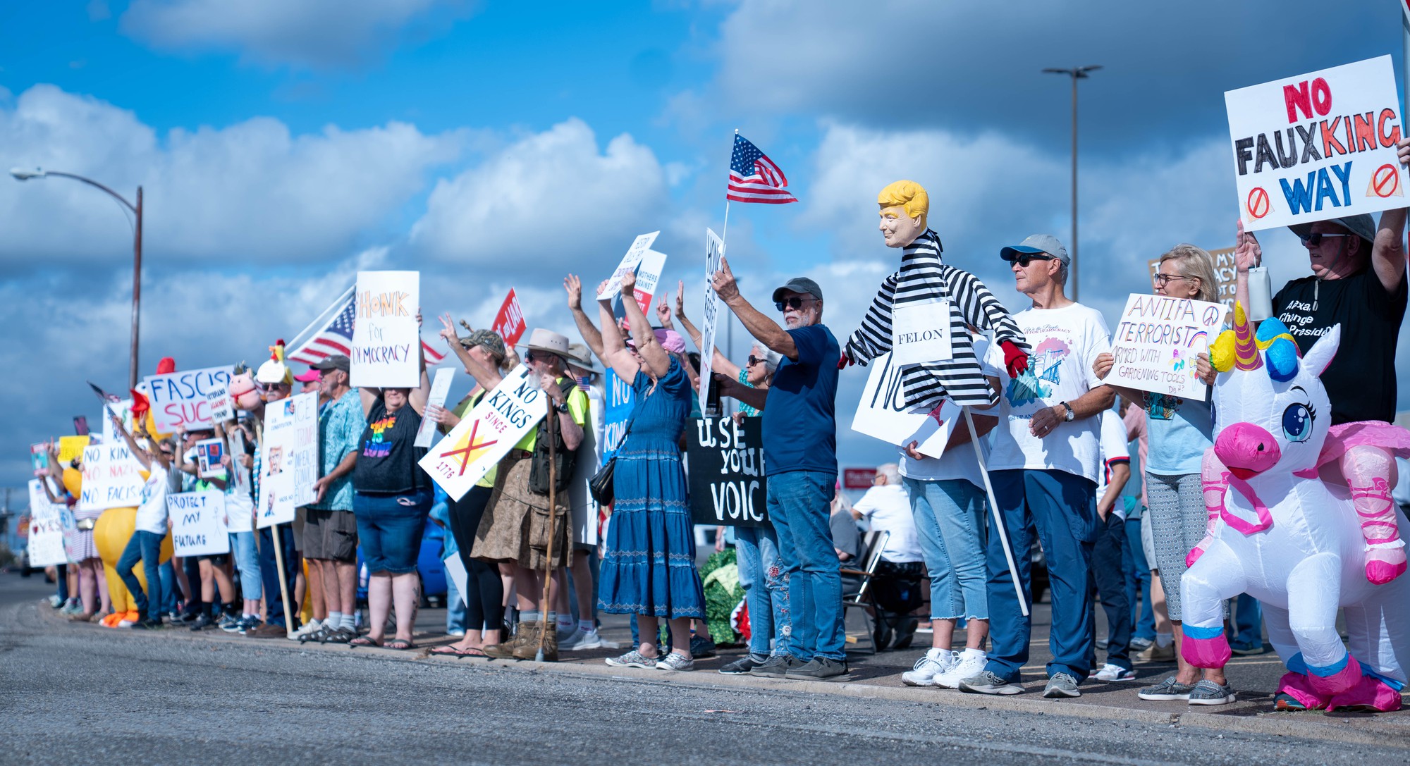 Protesters held American flags, signs and banners reading “No Kings” and “Defend Democracy,” rallying to reject what organizers described as President Donald Trump’s “authoritarian approach to power.”
