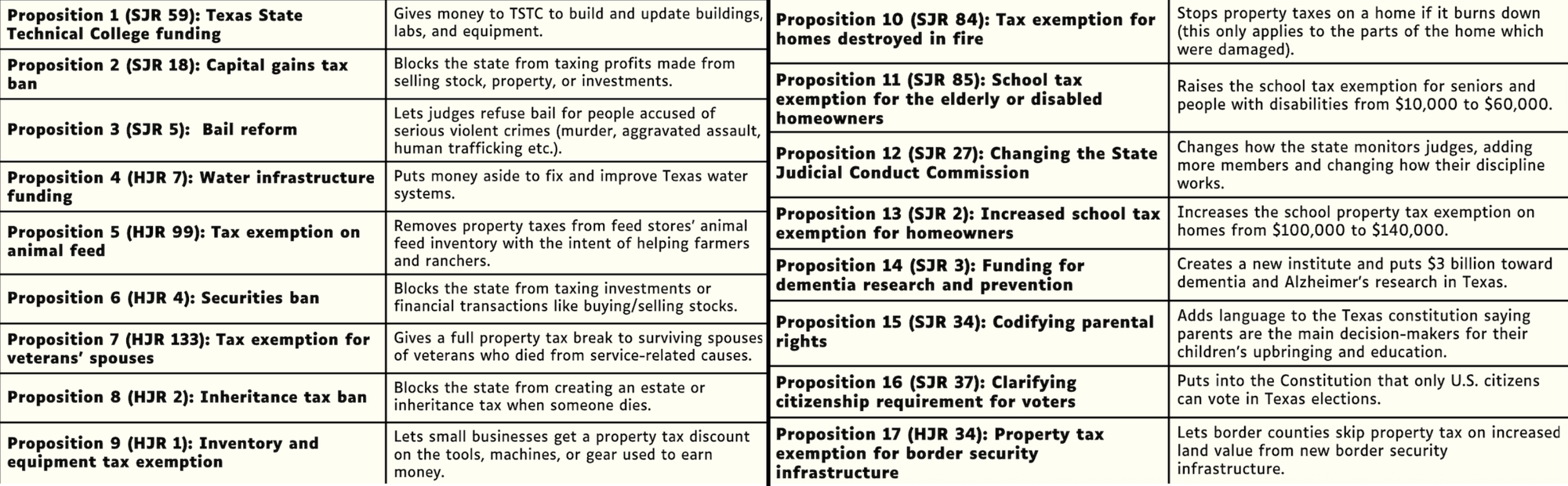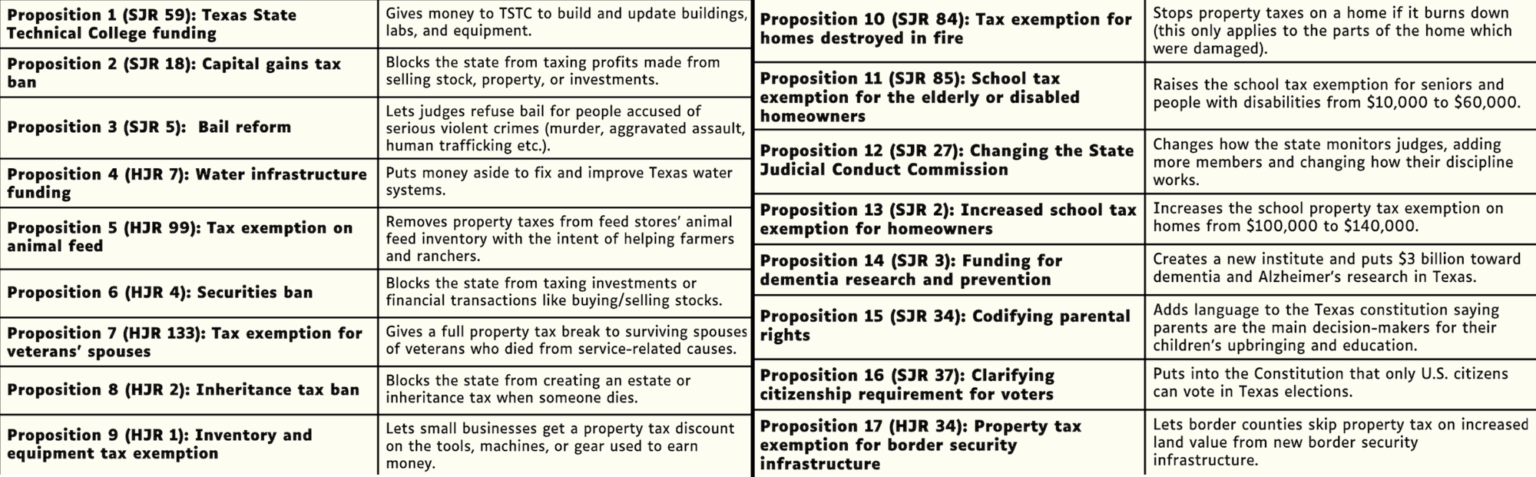 This election is over 17 proposed constitutional amendments. The proposed amendments cover issues such as taxes, infrastructure and amendments to the language within the Texas constitution. Of those 17 proposed amendments, 10 are tax-related.