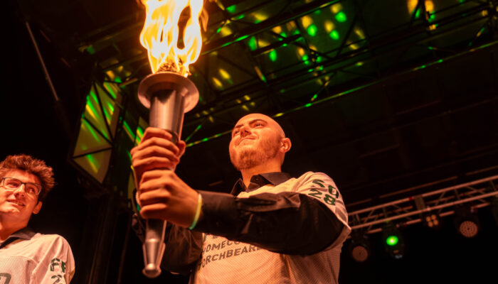 - Sophomore torchbearer Lance Dewey holds the flame on the homecoming stage Friday night. Sam Gassaway | Photographer