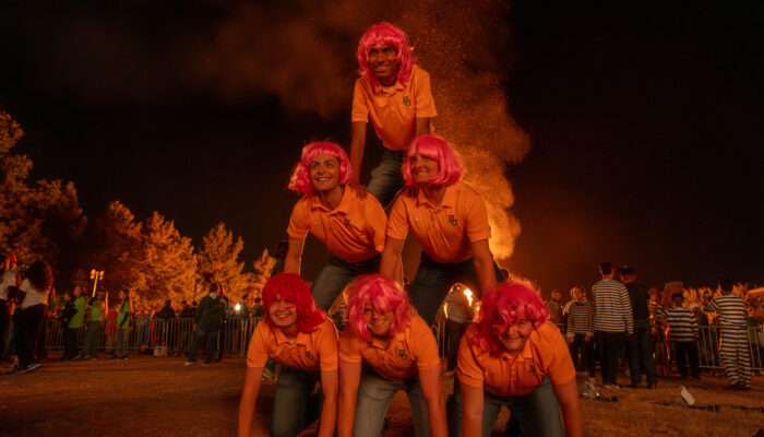 - Members of the Baylor Golden Wave Band form a human pyramid in front of the bonfire on Fountain Mall. Sam Gassaway | Photographer
