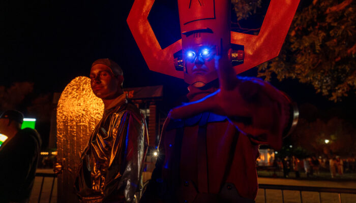 The NoZe Brotherhood protested at the event, carrying a variety of controversial and satirical signs. Sam Gassaway | Photographer- The homecoming pep-rally was full of costumed characters, including this Galactus and Silver Surfer duo. Sam Gassaway | Photographer