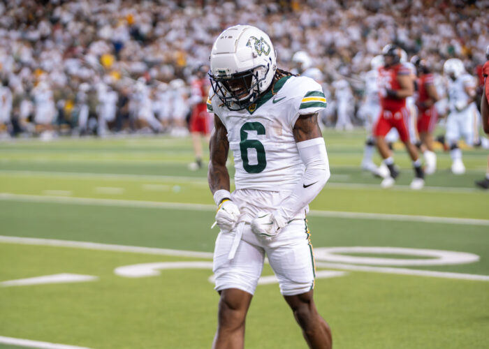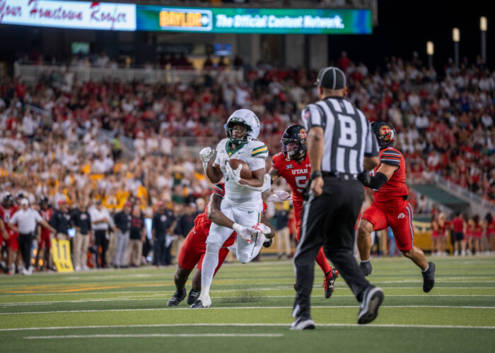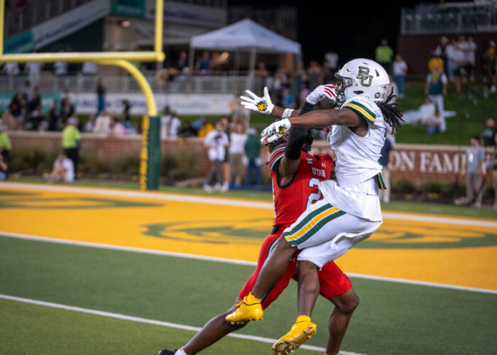 Senior wide receiver Kole Wilson is blocked by Utah's redshirt freshman cornerback LaTristan Thompson during the Bears' 55-28 loss against Utah at McLane Stadium on Saturday. Sam Gassaway | Photographer- Sixth year wide receiver Ashtyn Hawkins roars in celebration after an interception at the Baylor vs Utah football game on Saturday night at McLane Stadium. Caleb Garcia | Photographer