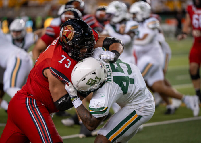 - Sophomore line backer Kyland Reed wrestles with Utah's redshirt senior offensive lineman Tanoa Togiai during the Bears' 55-28 loss against Utah at McLane Stadium on Saturday. Sam Gassaway | Photographer