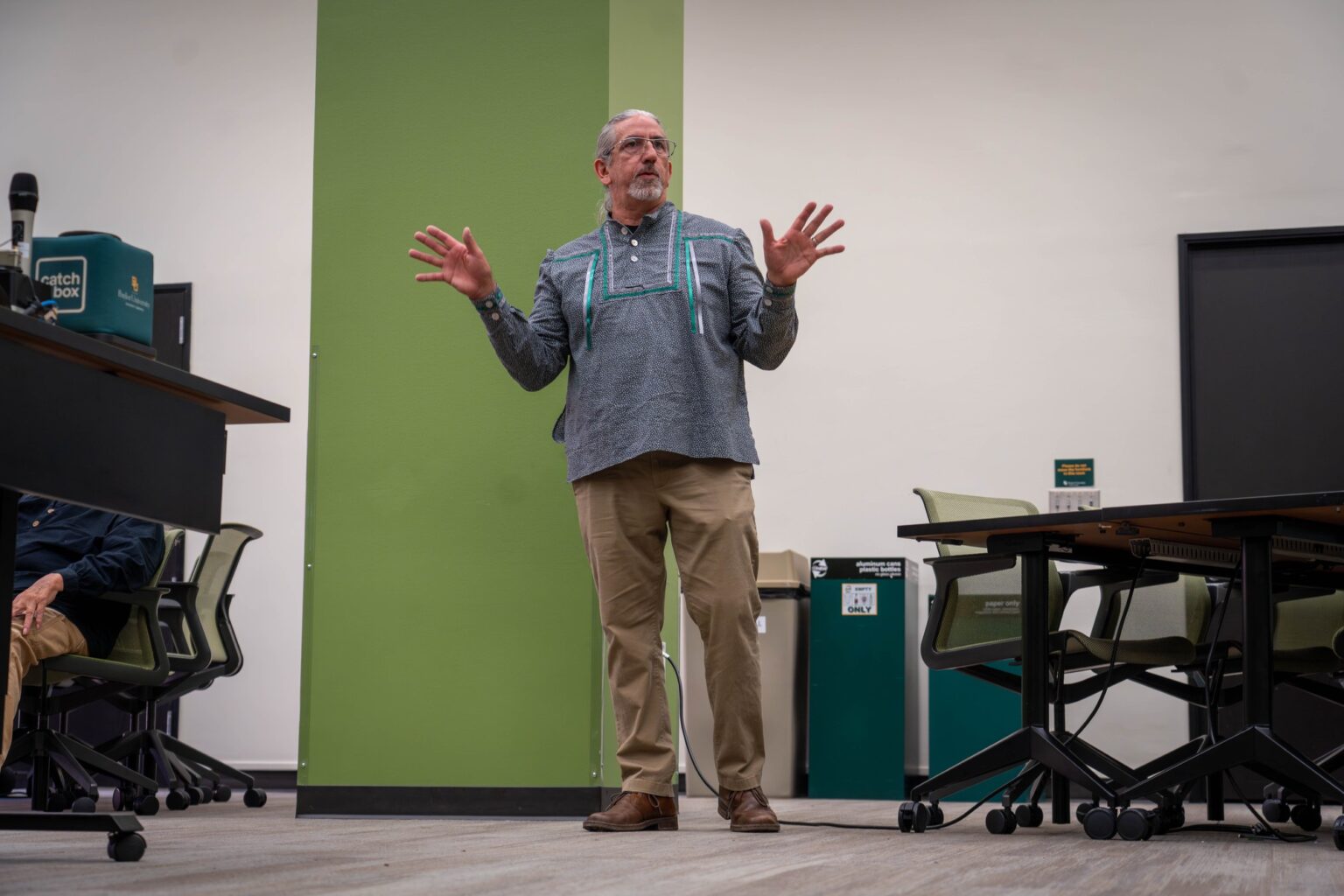Drawing on personal stories, Ross connected national themes of erasure and resilience to his own family, emphasizing how much remains unknown in the public understanding of Native history. He explained that the loss of Native languages across the United States was not the fault of the people themselves but the result of systemic efforts to erase their culture.