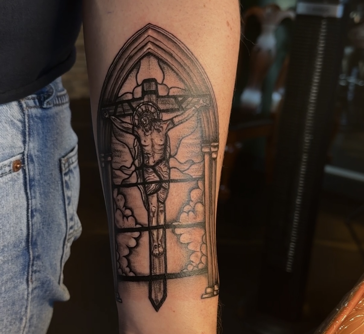 One of her favorite ongoing projects is a large stained-glass-inspired sleeve she is creating for Victor Boswell, a Waco-area resident and returning client. The piece features Gothic cathedral imagery rendered in blackwork and negative space.