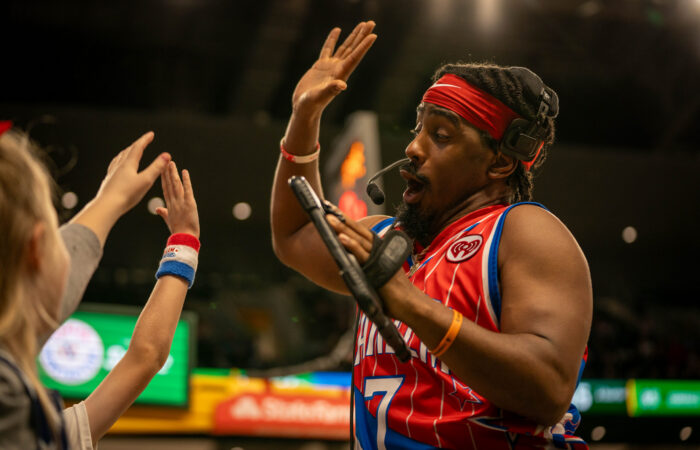 The Harlem Globetrotters make sure to engage with their fans during their games, such as during this slow motion high-five bit during their game at Foster Pavilion on Saturday. Sam Gassaway | Photo Editor