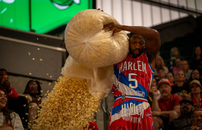 Showman Chandler "Bulldog" Mack spills popcorn on the audience during the Globetrotters game at Foster Pavilion on Saturday. Sam Gassaway | Photo Editor