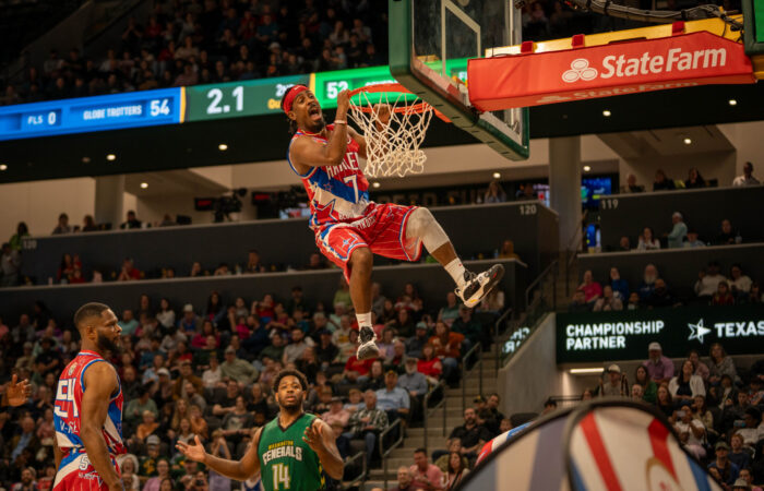 Harlem Globetrotters forward Joe “Jumpin” Ballard dunks the ball during the Globetrotters game at Foster Pavilion on Saturday. Sam Gassaway | Photo Editor