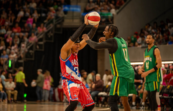 Harlem Globetrotters guard Latif “Jet” Rivers dances the ball around the Washington Generals' defense during the Globetrotters game at Foster Pavilion on Saturday. Sam Gassaway | Photo Editor
