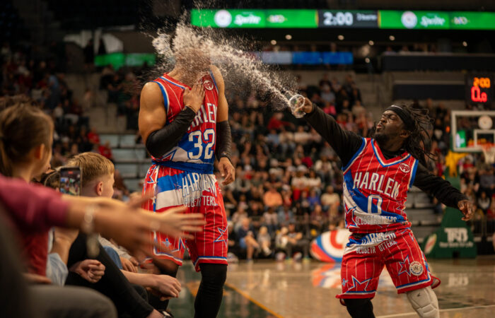 Harlem Globetrotters guard Justin “X-Over” Tompkins splashes his teammate Latif “Jet” Rivers with water during the Globetrotters game at Foster Pavilion on Saturday. Sam Gassaway | Photo Editor